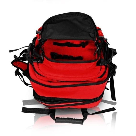 Apteczka plecakowa posiada cztery, oddzielne komory. Jedna z komór dopasowana jest wymiarami do przenoszenia kołnierzy ortopedycznych, kolejne dwie komory wyposażone są w kieszenie z siatki zasuwane na zamki błyskawiczne oraz kieszenie zapinane na rzep. Ostatnia komora posiada różnej wielkości gumki oraz karabińczyk do przyczepienia np. kluczy. Na kieszeni przedniej naszyta jest taśma odblaskowa.