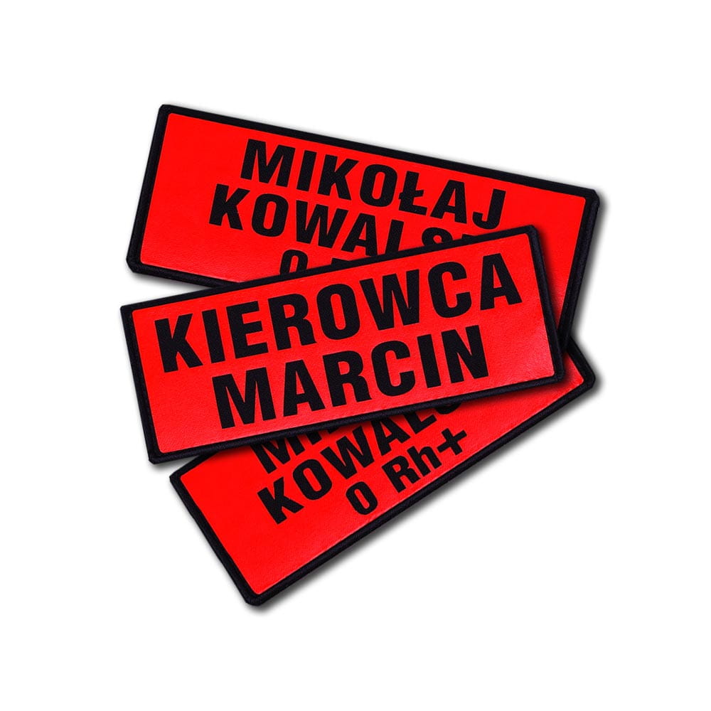 Odblaskowy emblemat podszyty rzepem (haczyki) z 1, 2 lub 3 linijkami tekstu: imieniem, nazwiskiem, ksywką, grupą krwi, funkcją itp.,