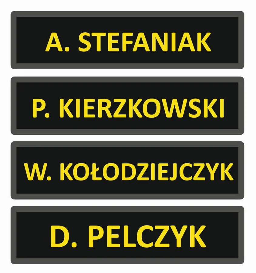 Wąski odblaskowy emblemat podszyty rzepem (haczyki) z imieniem lub pierwszą literą imienia i nazwiskiem,