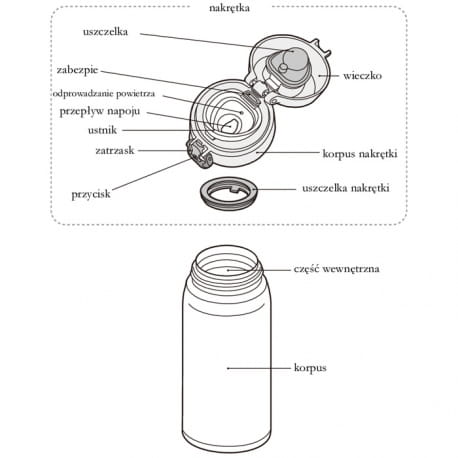 Praktyczny design nakrętki i uszczelki termosu umożliwia łatwą konserwację i dokładne mycie. Wystarczy nacisnąć zabezpieczenie (1) a ustnik wysunie się z nakrętki (2).