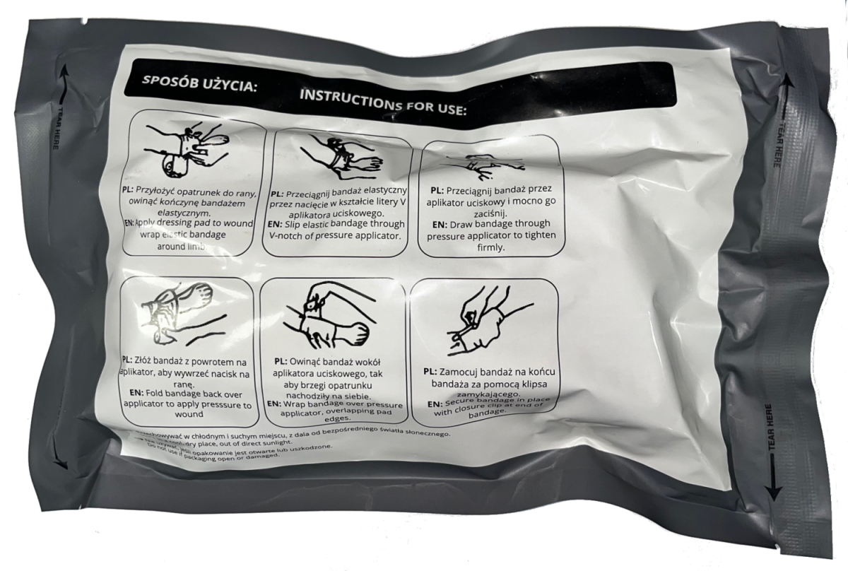Bandaż wojskowy Izraelski to bandaż do szybkiego opatrywania ran. Bandaż jest jak elastyczny leggins. Posiada elastyczny wspornik w kształcie półksiężyca, który może wywierać pewną siłę na ranę. Jest bardzo skuteczny w przypadku szybkiej hemostazy pasmowej.