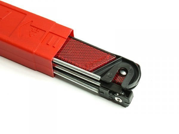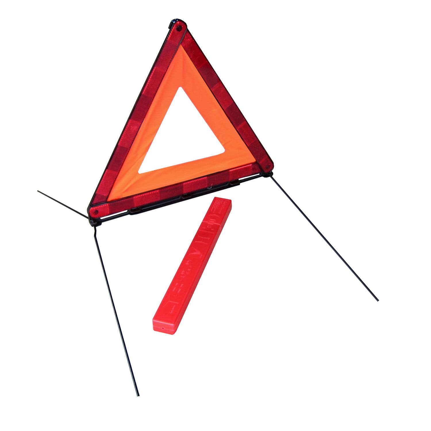 Nowy, rozkładany odblaskowy trójkąt ostrzegawczy. Wykonany z twardego tworzywa ABS na metalowych nóżkach w etui.