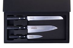 Zestaw Masahiro w opakowaniu ozdobnym składający się z trzech noży z serii Sankei: Chef 180mm Bread 210mm oraz Paring 90mm. Idealnie dobrany skład noży, którymi poradzimy sobie z większością zadań związanych z cięciem, wraz z pięknym pudełkiem tworzą idealny zestaw na prezent.