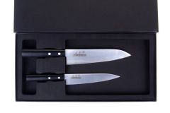 Zestaw Masahiro w opakowaniu ozdobnym składający się z noży: Sankei Chef 180mm oraz Sankei Utility 150mm. Taki skład noży to niezbędne minimum, które powinno znaleźć się w każdej kuchni, dodatkowo zapakowane w piękne pudełko tworzą idealny zestaw na prezent.